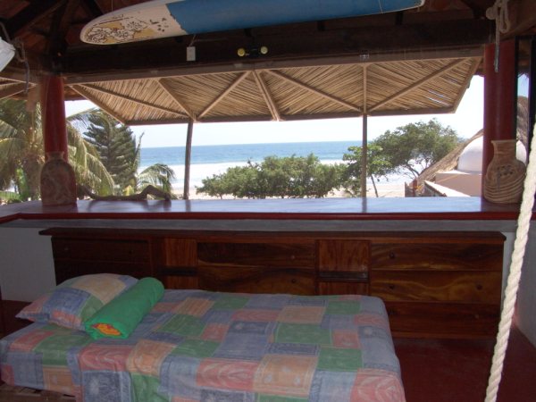 This is the owners accommodation when he is in residence and it has all the amenities. A queen size bed, tiled bathroom, lots of surfing pictures, and folkloric art adorn the walls. A private bath room with shower and kitchen finish off the room. This small suite can make for a sixth accommodation should a large party require more than five accommodations. The suite faces the mountain with just a peek of the ocean from the kitchen window. Check with staff for availability.